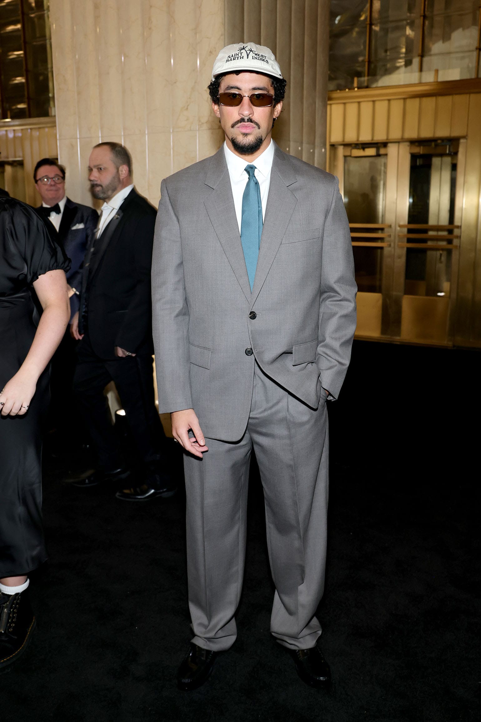 We’ve seen the musician rock the ball cap and suit combination before, like at the Grammys in 2023, for the Saturday Night Live 50th Anniversary special in February, and at Calvin Klein’s Autumn/Winter 2025 runway show. It’s a move pulled from the 1990s famous guy playbook, rocked by guys like Denzil Washington, Robin Williams, and JFK Junior pre-millennium.