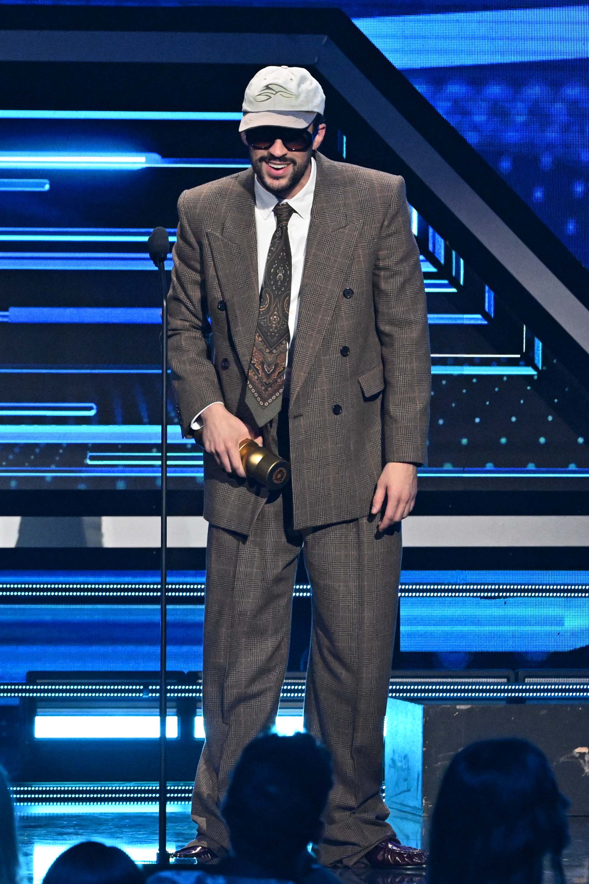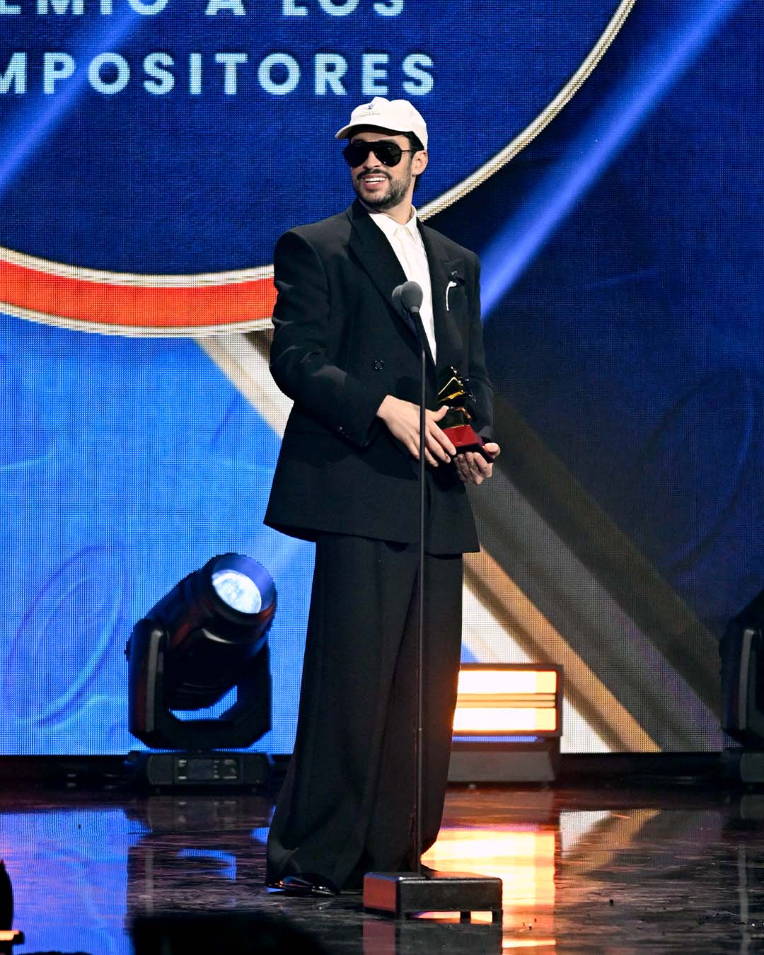 However, he’s also partial to paring it back – taking low-profile suits for a spin and wearing them as effortlessly as he picks up musical wins. Last night, in Las Vegas, the mega star picked up five Latin Grammys, and it was his certified formula for relaxed and assured tailoring that he turned to for his victory lap. This meant a swishy double-breasted suit chilled out with a white Shapes USA ball cap and a shirt worn sans-tie. To round out the look, Bad Bunny wore a pair of polished, black leather boots.