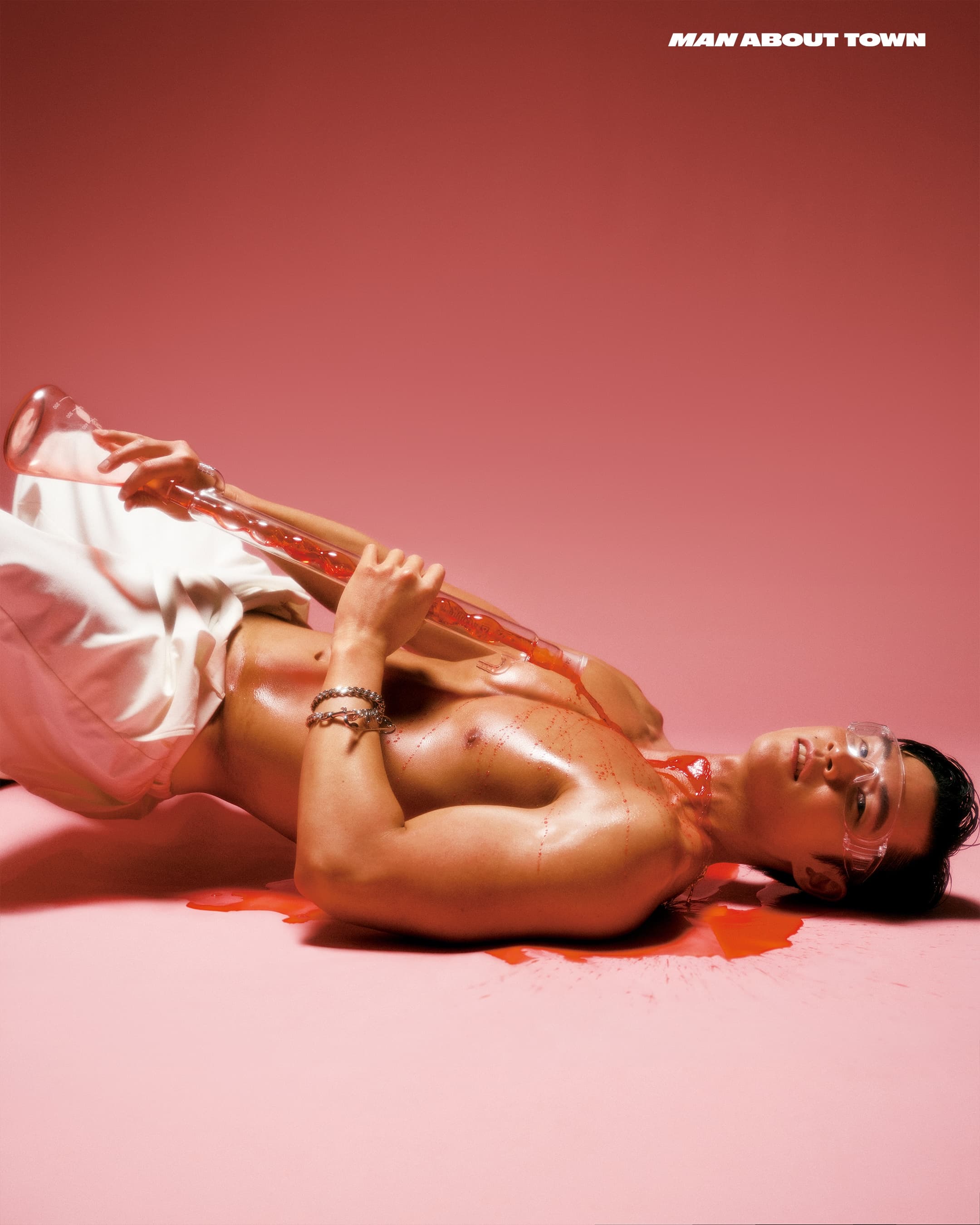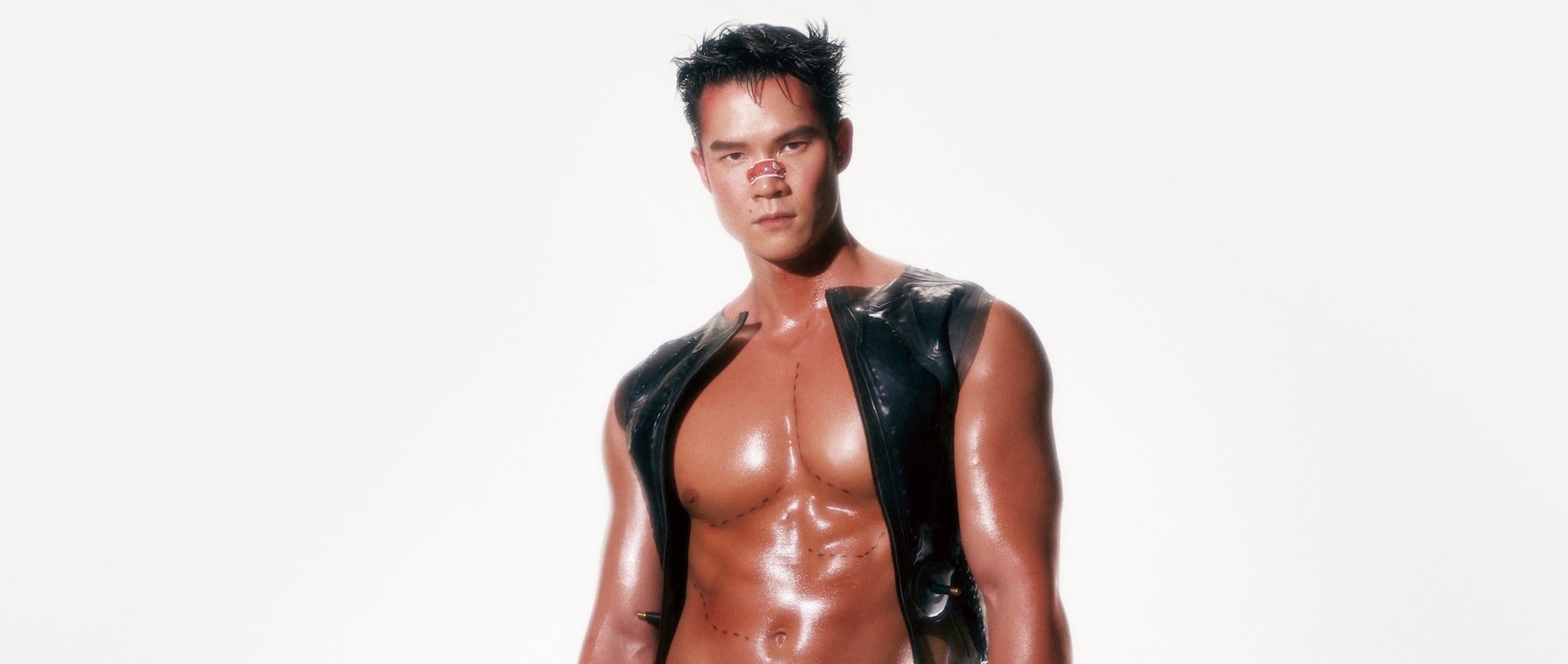 Nicholas wears headpiece KOWLOON CITY BOY, vest TIBI from HARVEY NICHOLS, short DRÔLE DE MONSIEUR from HARVEY NICHOLS