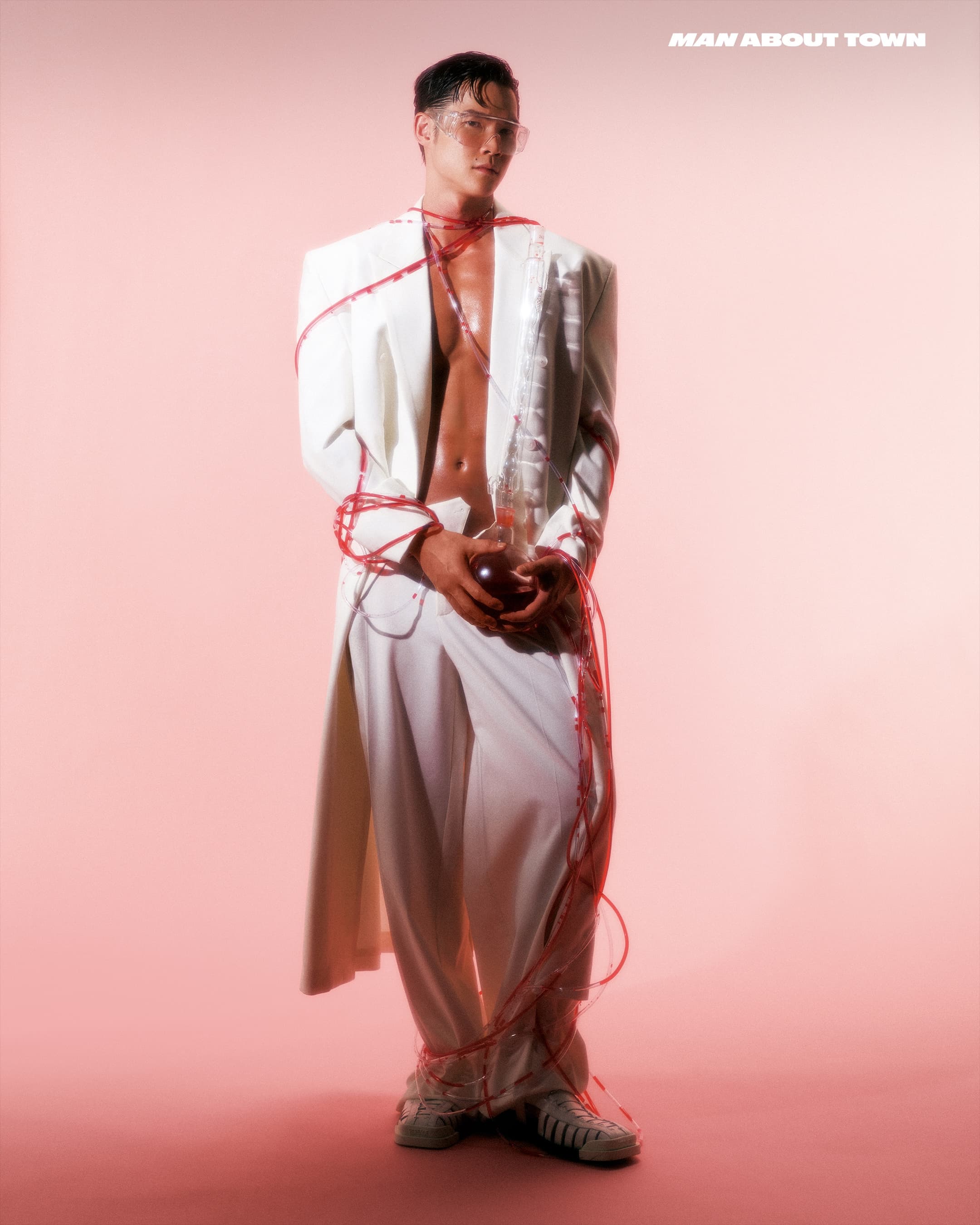 Nicholas wears coat, trousers HARRISON WONG, shoes VERSACE