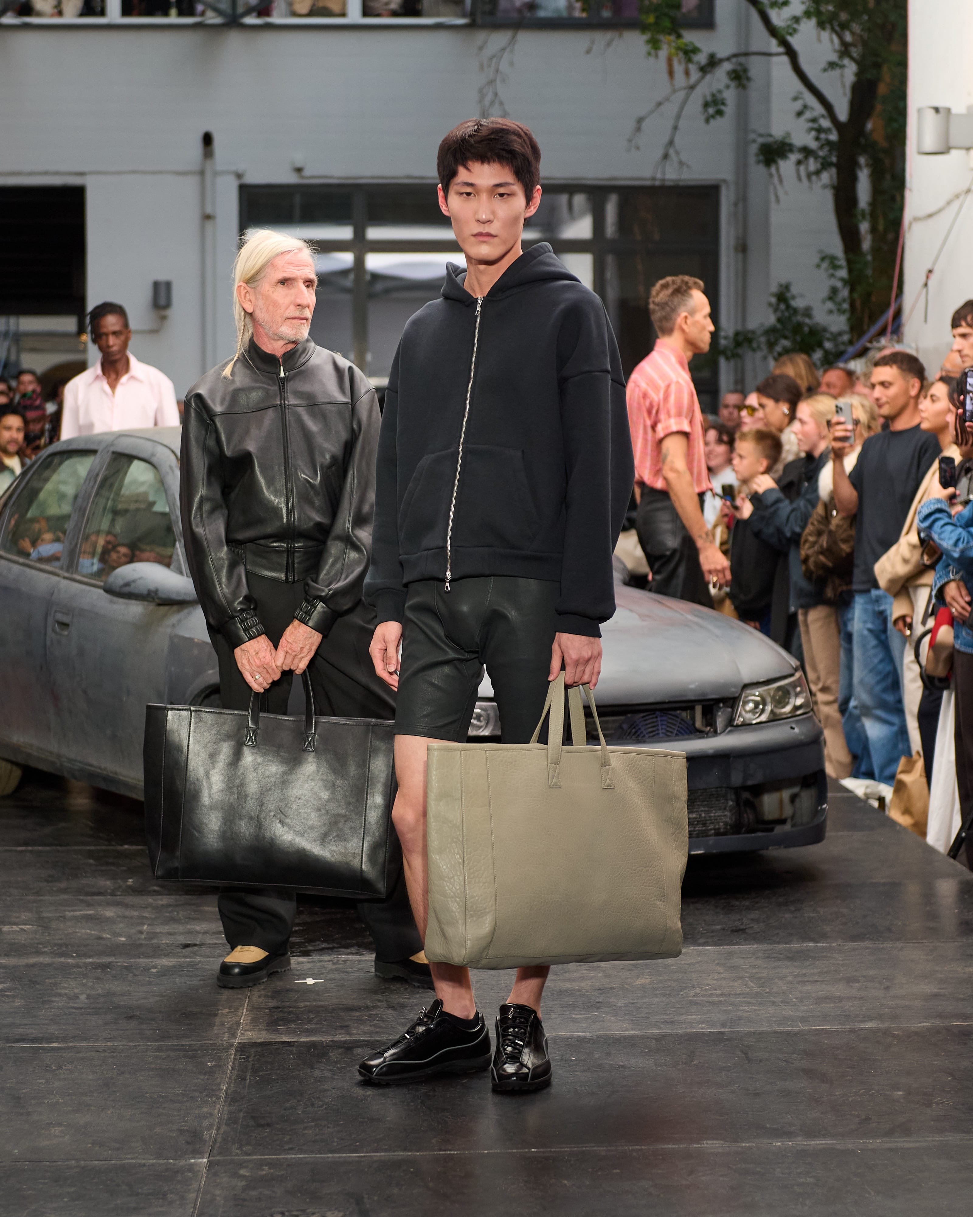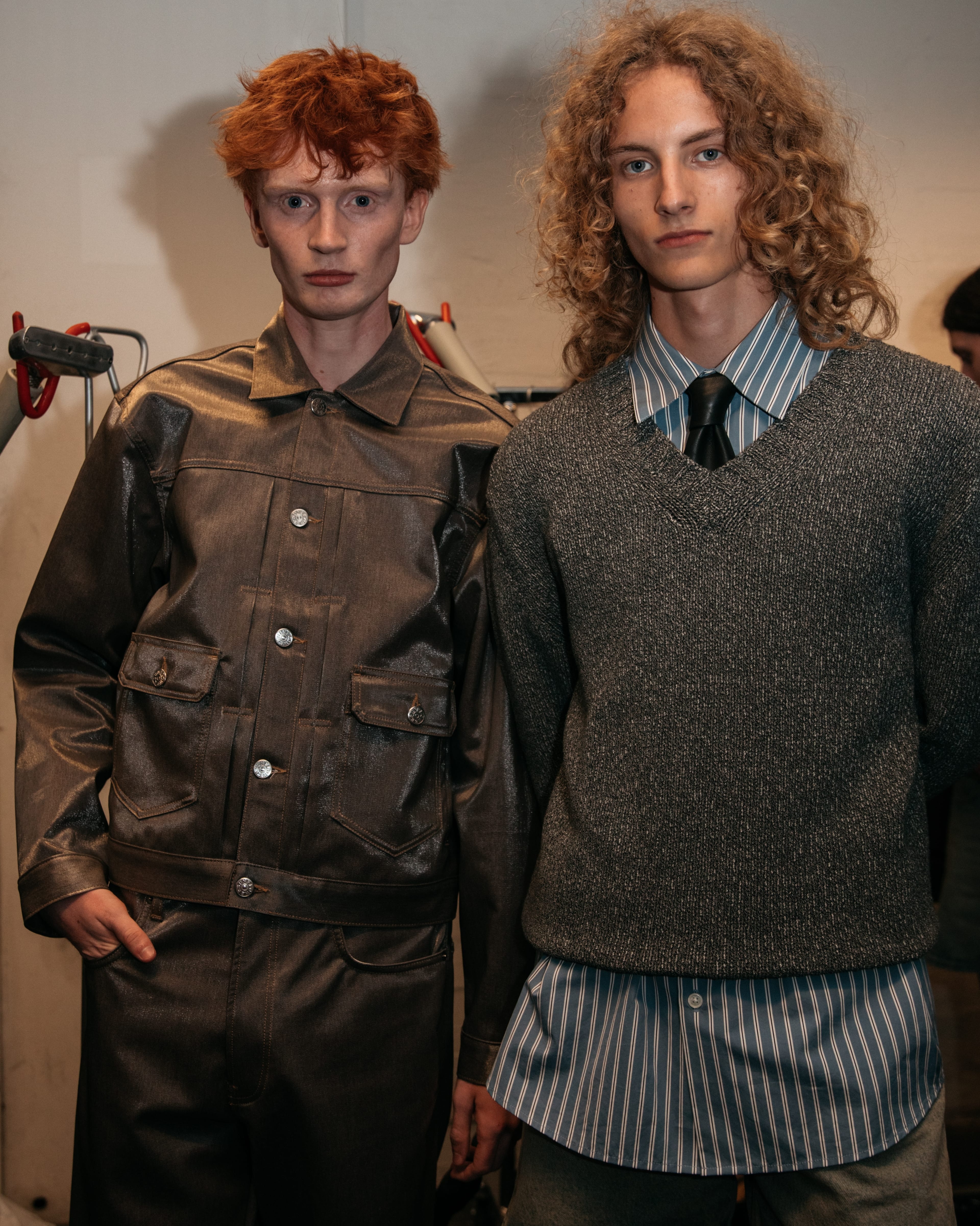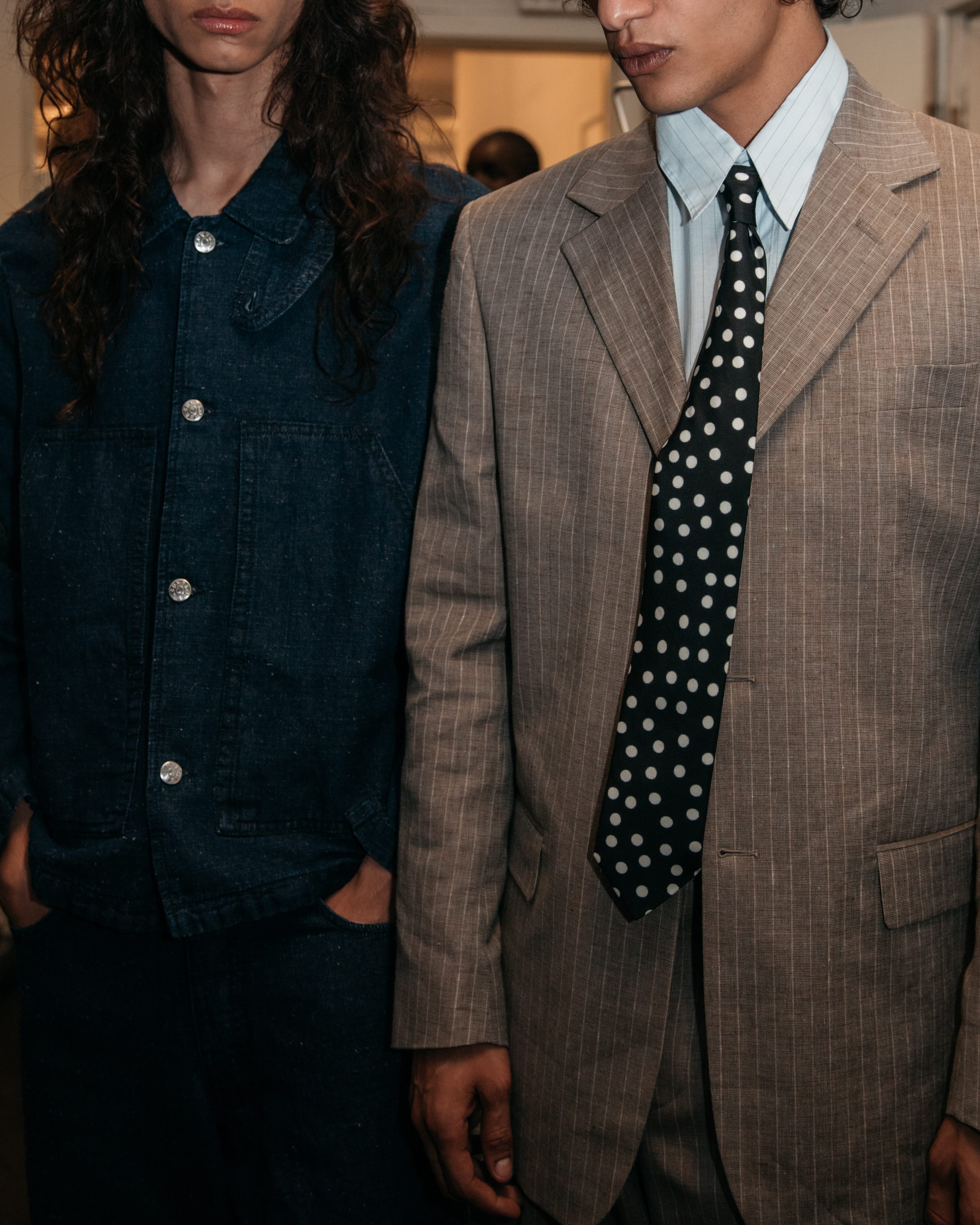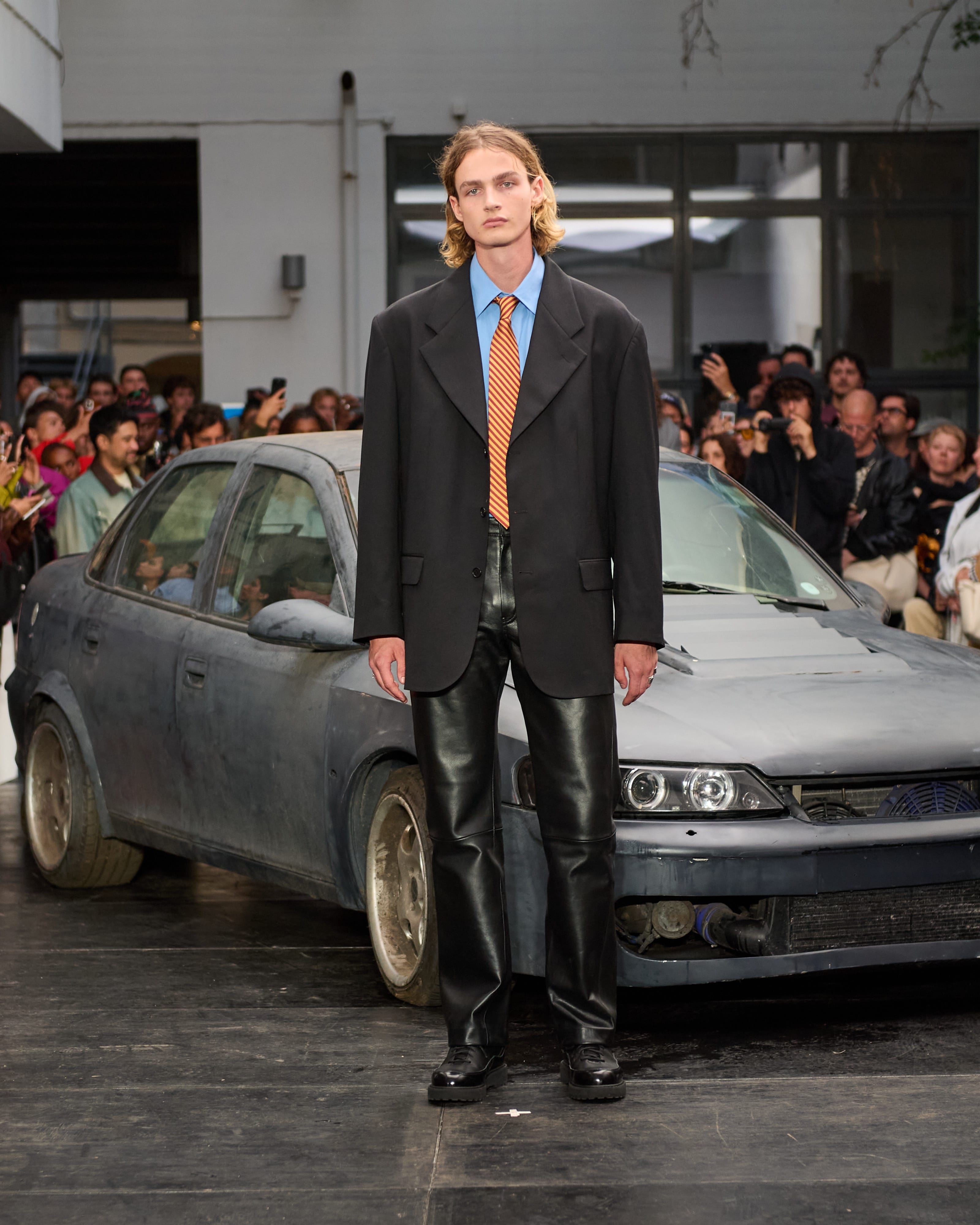 Opening looks saw models wear wide lapel three-button suits. And later blazers were paired with steamy leather bottoms. According to the accompanying show notes, “the collection is worn as though pulled from a suitcase,” which could explain the cohesive yet mismatched styling where tailoring wasn’t used to conform, but to stand out. Washed brown jackets were paired with polka dot ties, tailored overcoats with cycling shorts, and leather jackets worn over blazers. These guys knew the rules, and they chose to do things in their own way.
