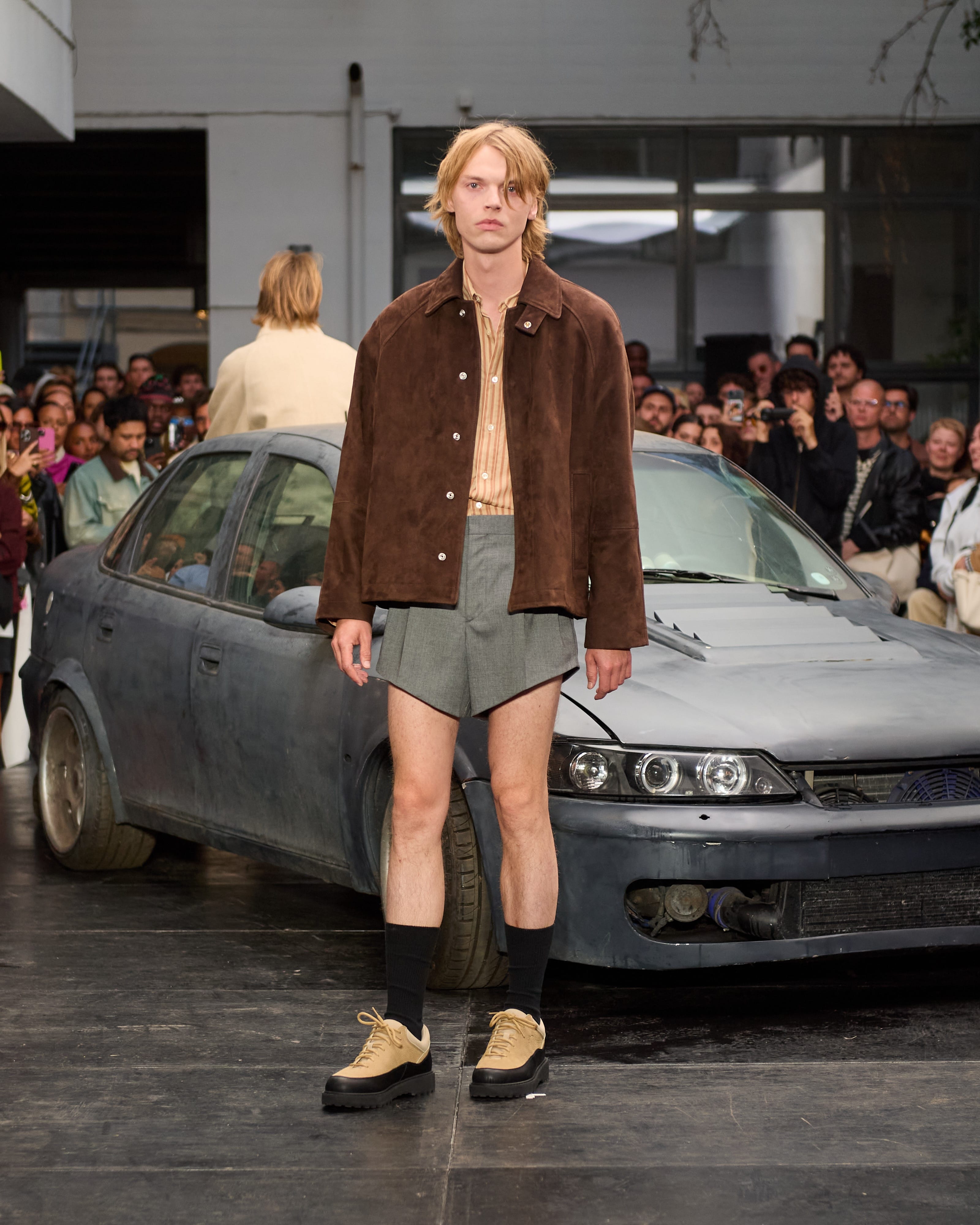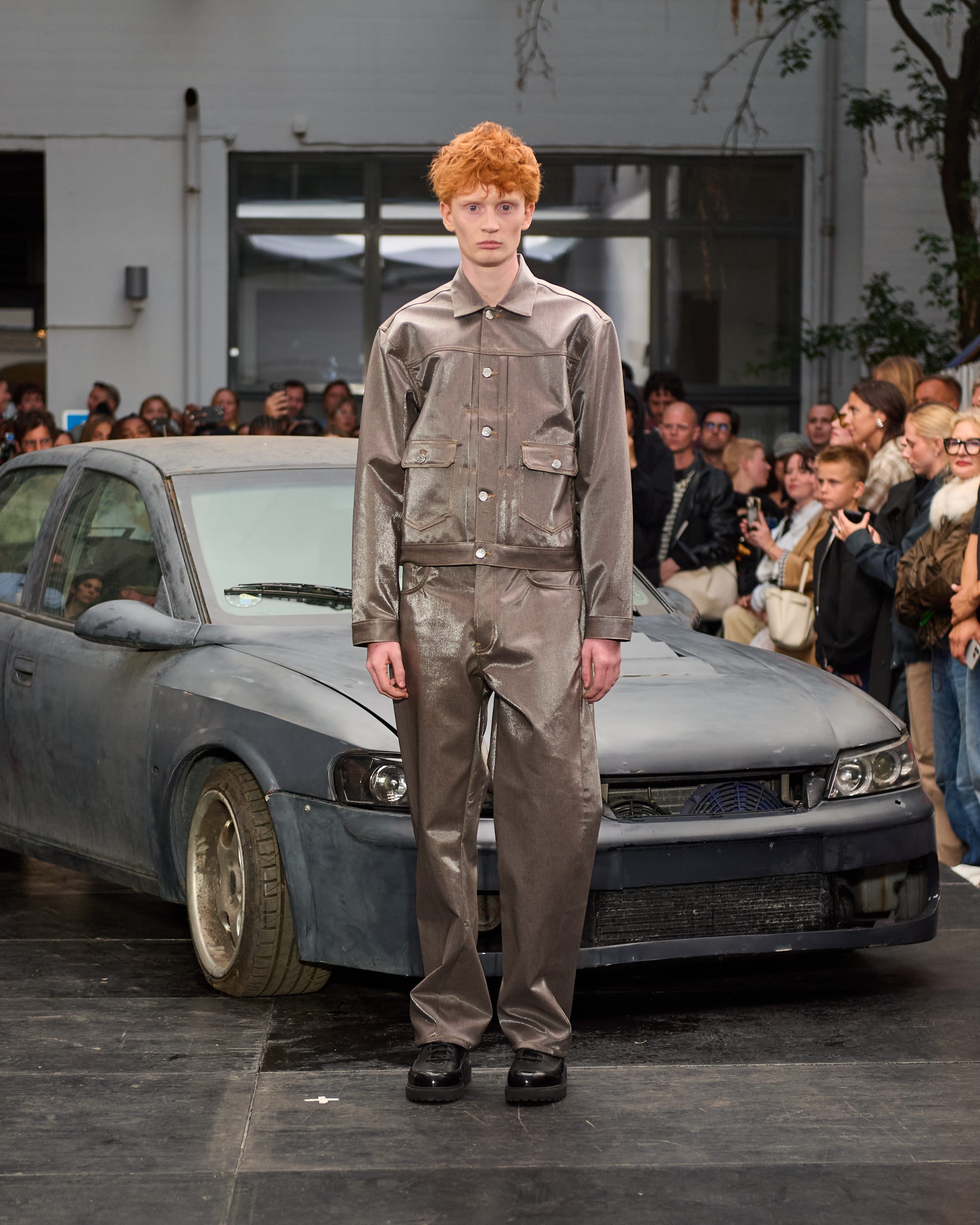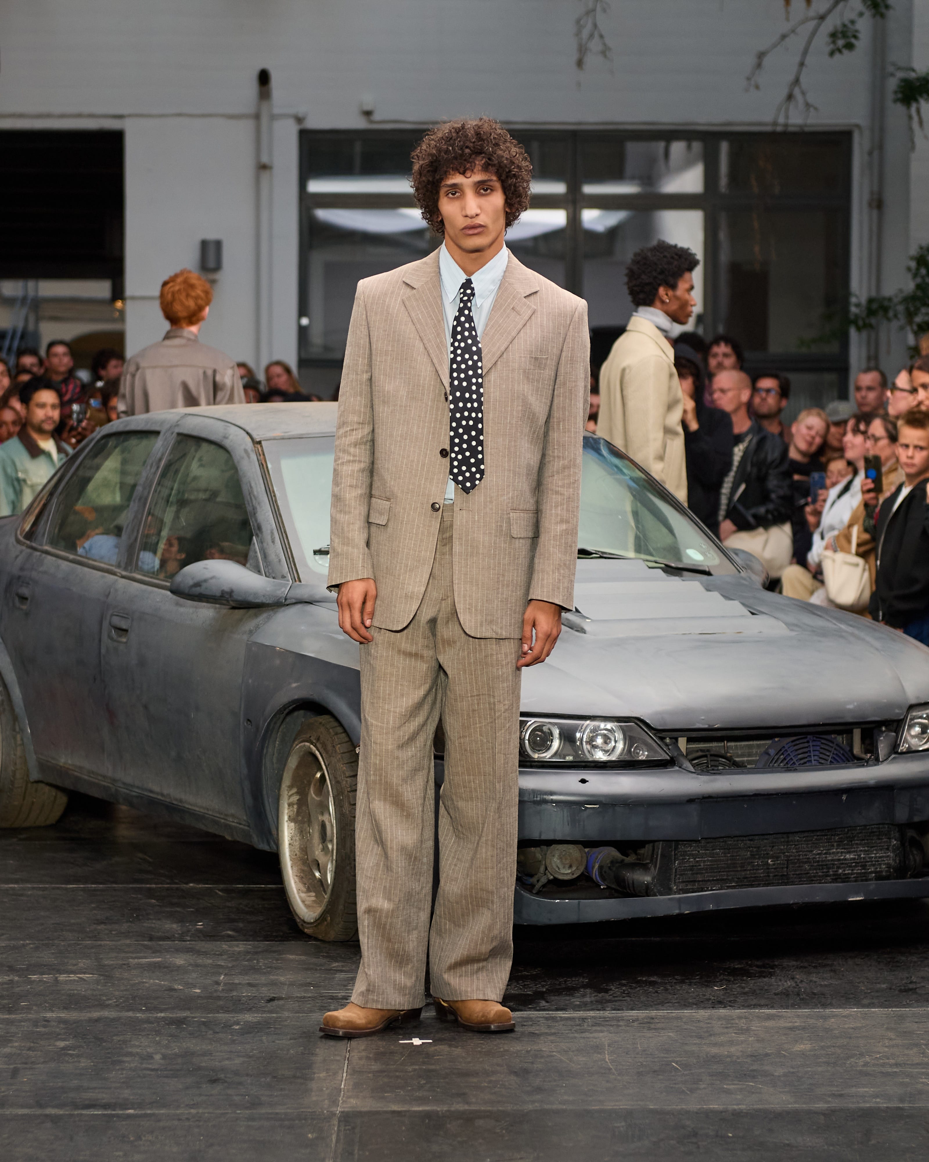 Copenhagen-based Sunflower’s Spring/Summer 2026 show looked more like a car meet than a catwalk. Models stalked a modded Opal Vectra, pausing to pose in front of it. Guests lurked, as if waiting to catch a glimpse of a passing drag race zooming by. But the label’s band of models weren’t your typical boy racers. These guys looked more like 1970s cool guys.