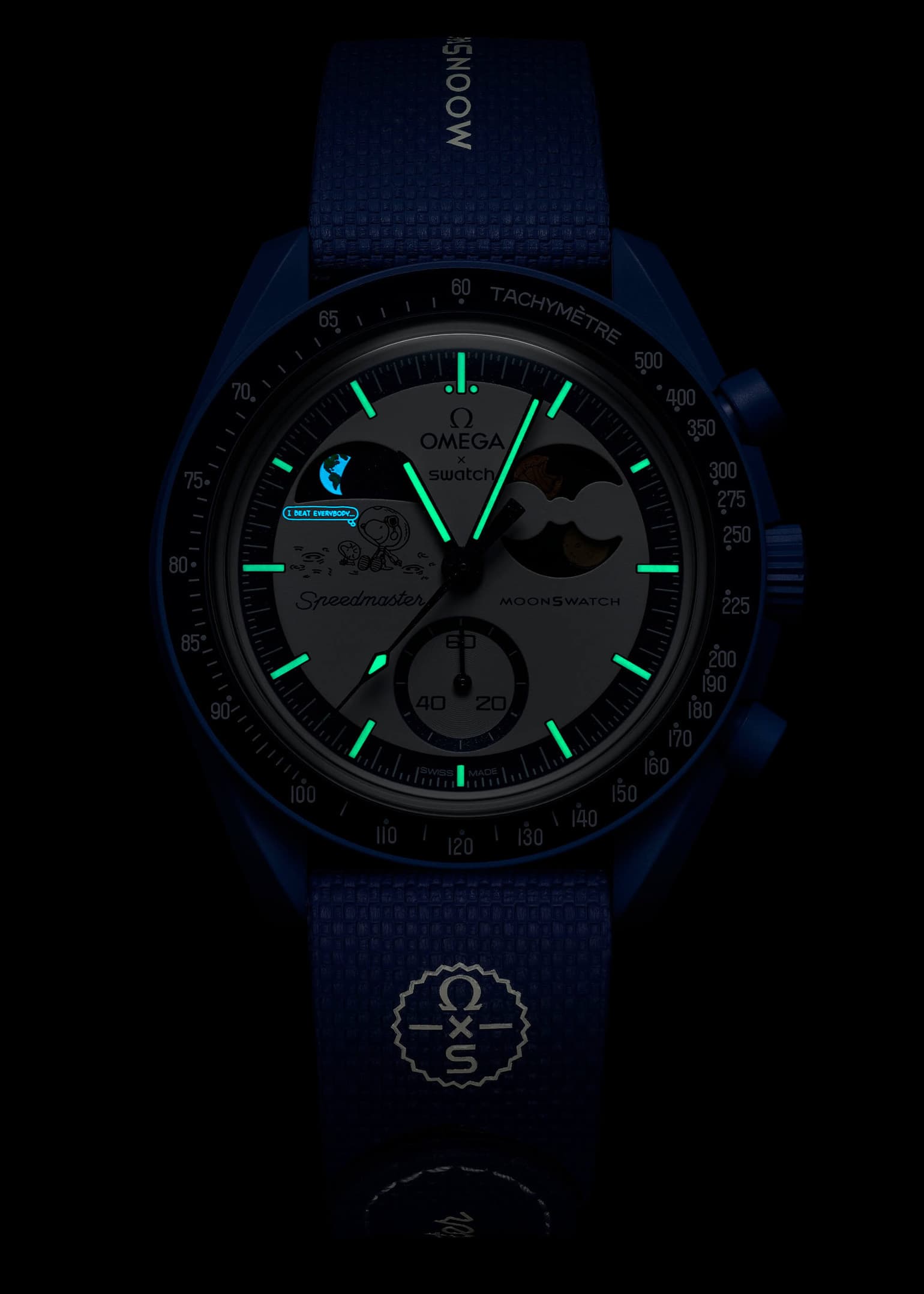 So what does the fourth Moonshine Gold MoonSwatch model look like? Like previous releases, you’re getting a nice, solid navy case and rubber strap with a Bioceramic loop, as well as a white opaline dial with uber-visible hour markers thanks to some handy Grade A Super-LumiNova.