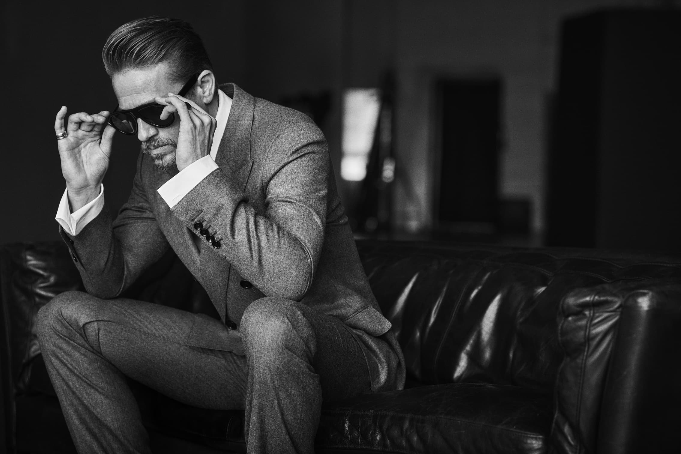 Charlie wears blazer, trousers, dress shirt, & sunglasses TOM FORD; ring DAVID YURMAN