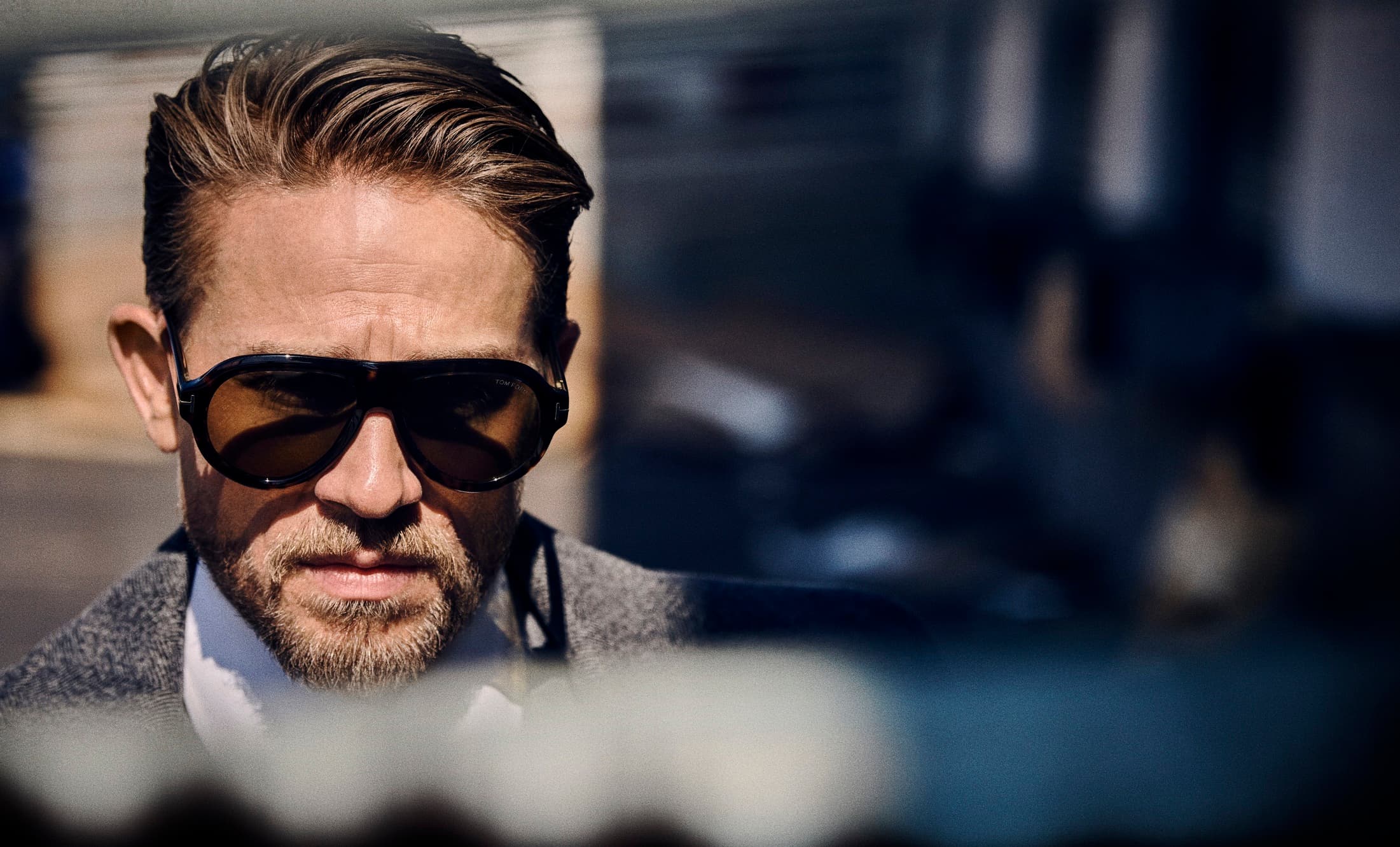 Charlie wears blazer, dress shirt & sunglasses TOM FORD