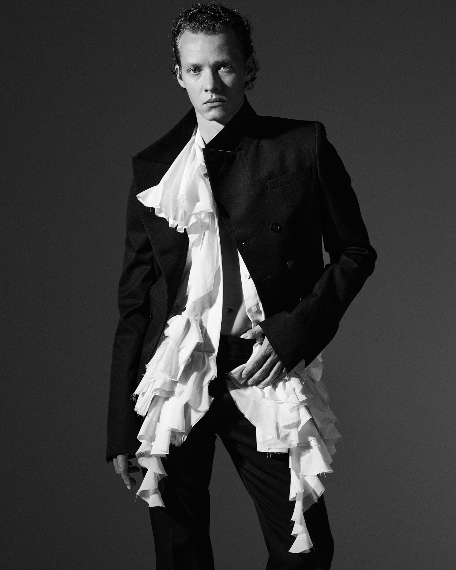 Work, it seems, has been keeping him alert. He’s fresh from his first Venice Film Festival, with castmates Jacob Elordi, Mia Goth, and Oscar Isaac, at which Frankenstein was unveiled to critics and film aficionados who flocked to the floating city for a first glimpse at the forthcoming awards season’s hopefuls. “[Venice Film Festival] is so crazy,” he laughs.“Everything you get with awards or festivals – the cars queuing, photoshoots, press – you have all the same things but on boats. Seeing 50 boats queued up is really, really funny. It’s a bit like a ride in a theme park.”