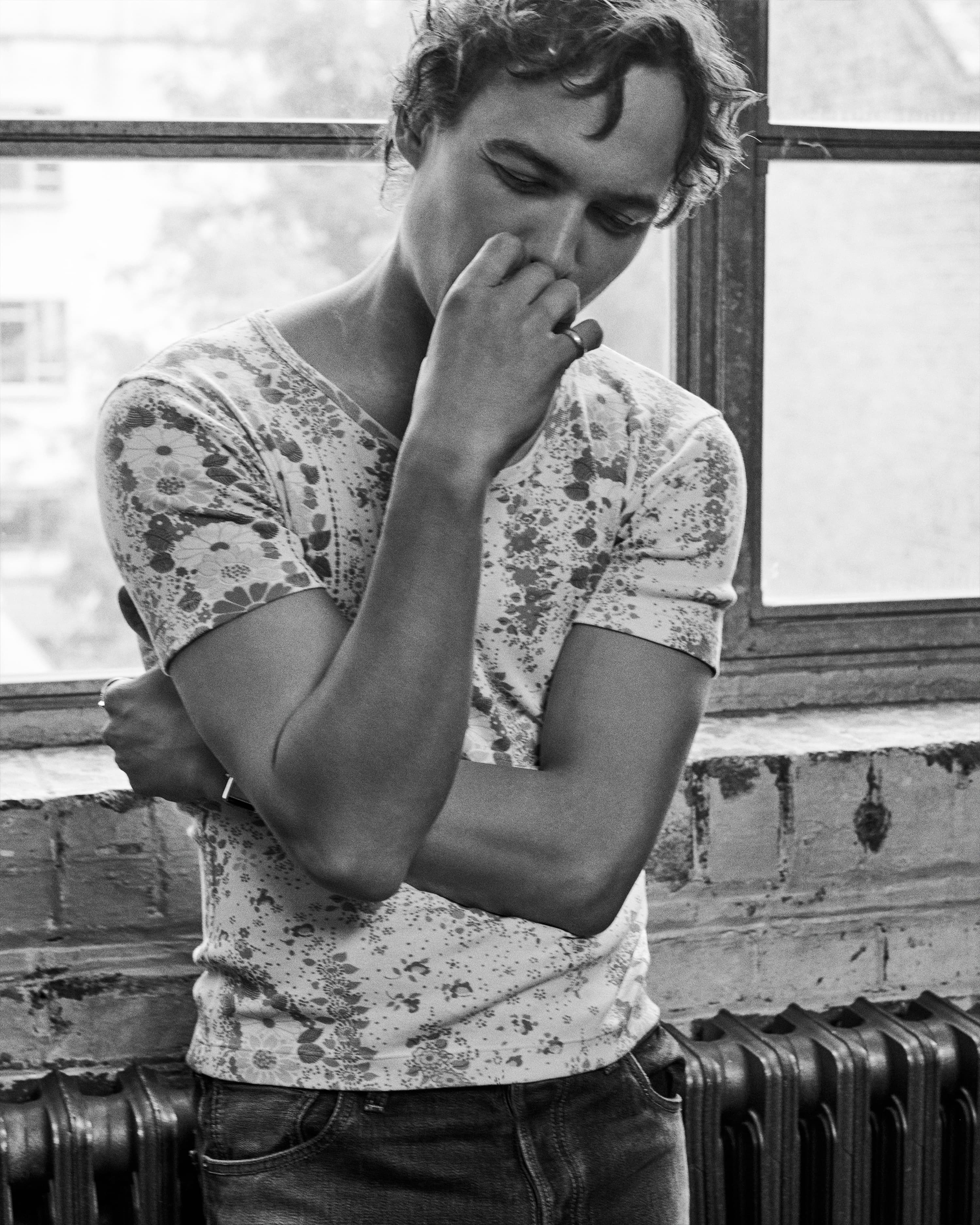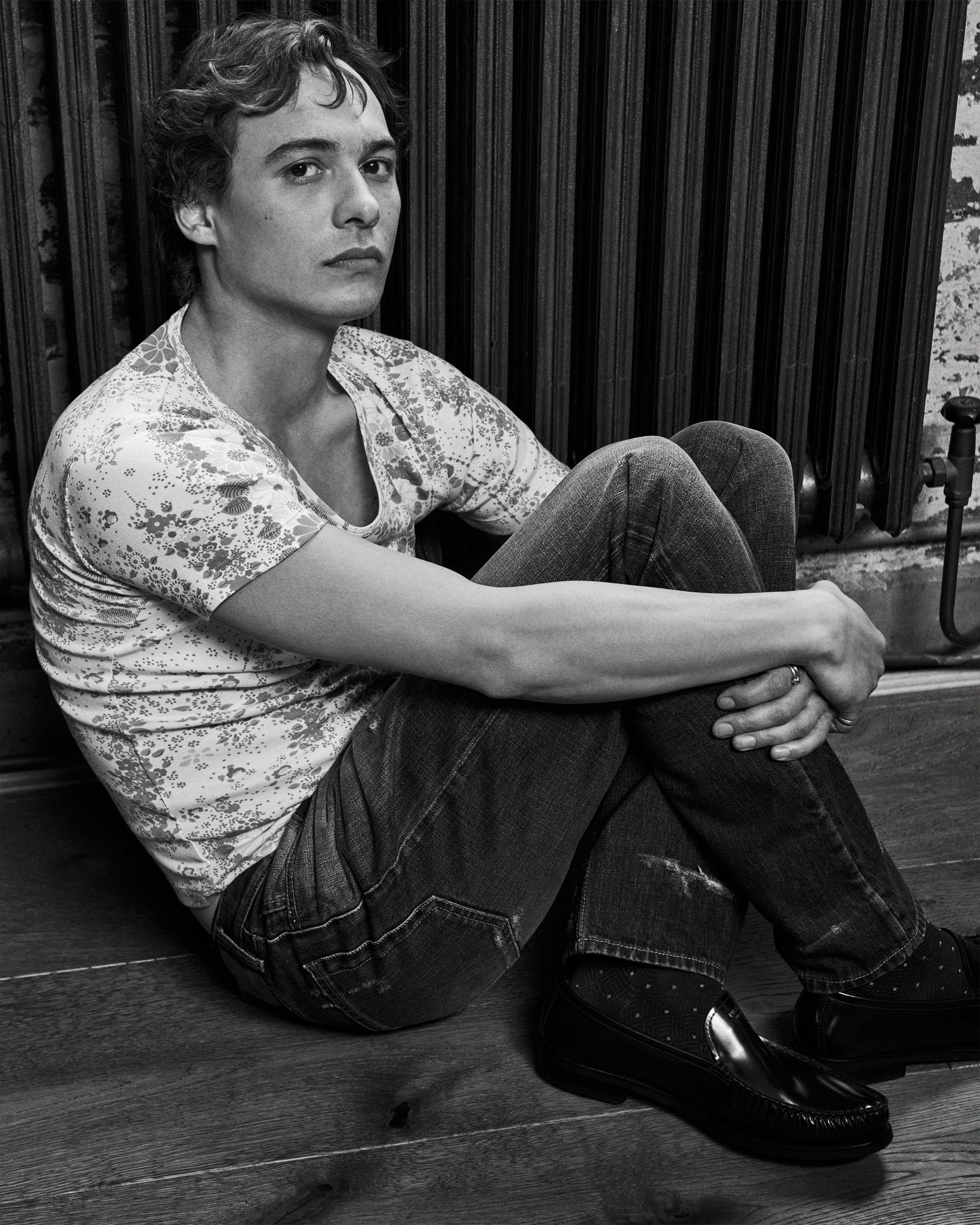 T-shirt, jeans & shoes PRADA, socks PANTHERELLA, necklace, watch and ring on left hand index finger CARTIER; all other rings Frank’s own