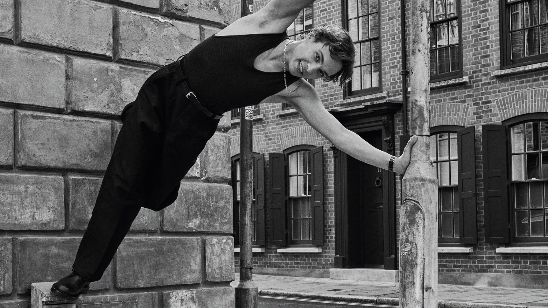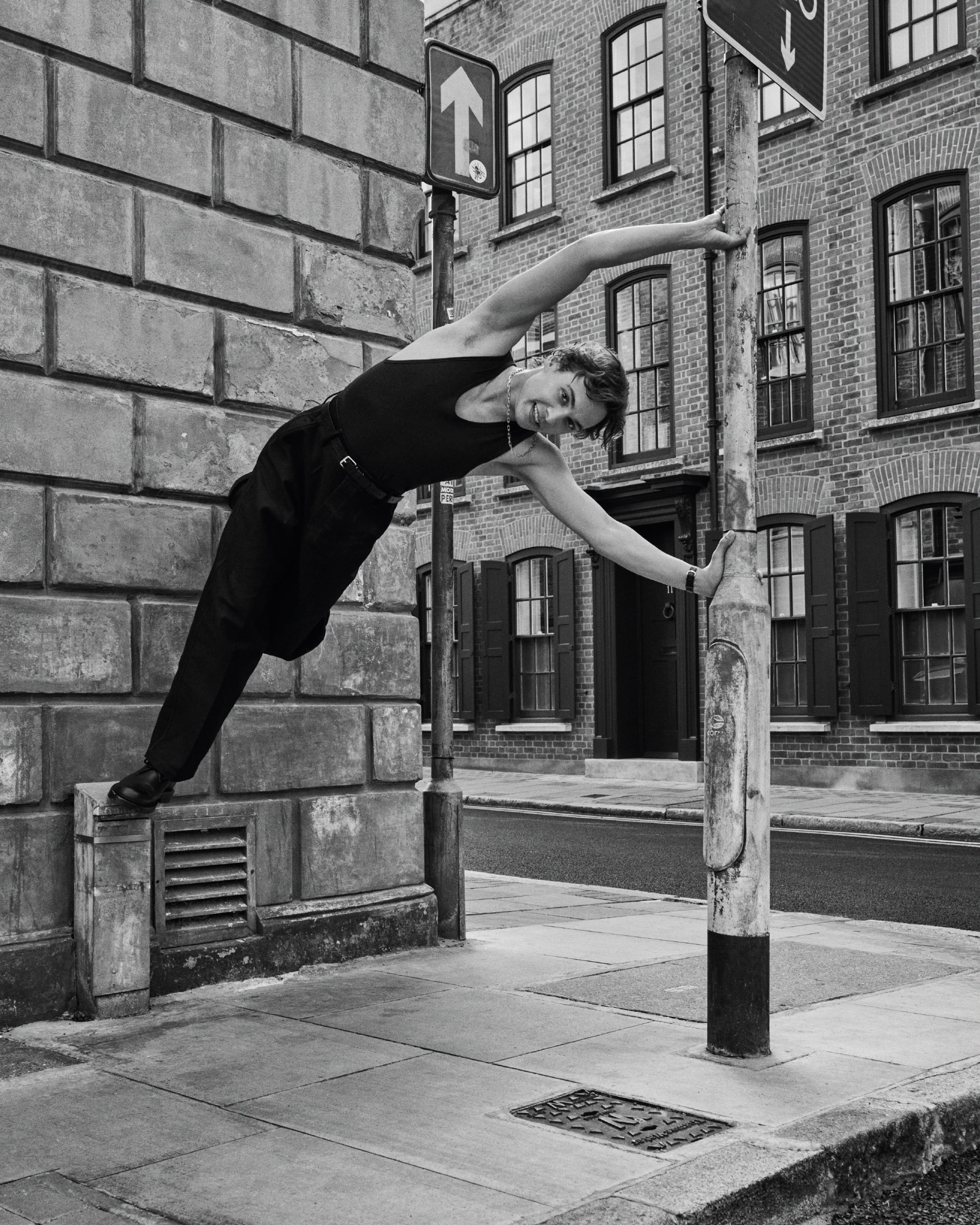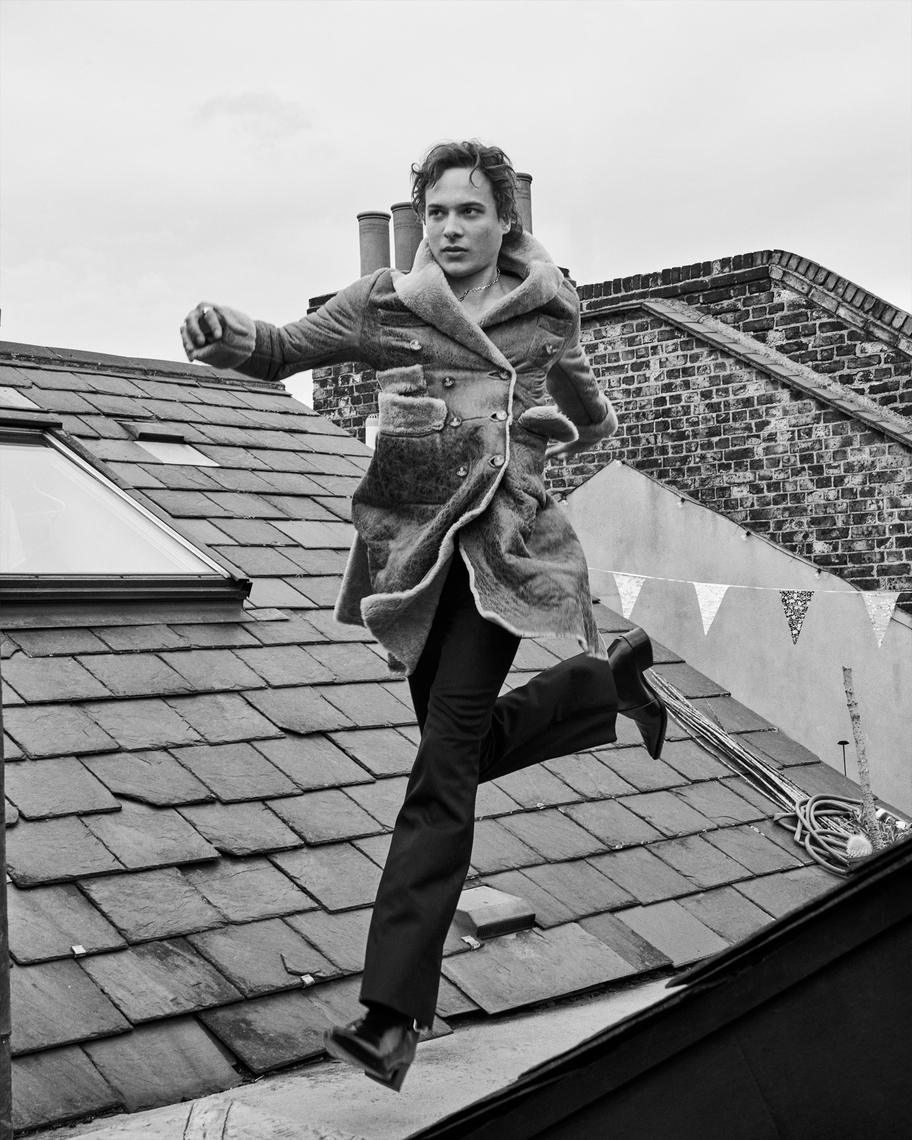 From discovering the root of Mike to branching out his idiosyncrasies, Dillane grew into his counterpart’s physicality. “I remember Harris saying he wanted Mike to look like a flower with all the moisture sucked out of it,” he says. And so Dillane lost some weight and began paying great attention to how individual people move. “I became obsessed with how differently everyone walks. If you start looking at it, some walks are insanely dramatic. There was a certain athleticism and also a certain hunchedness that I wanted to achieve with Mike. This fighting spirit, this low self-esteem, this kind of foxy quality.”