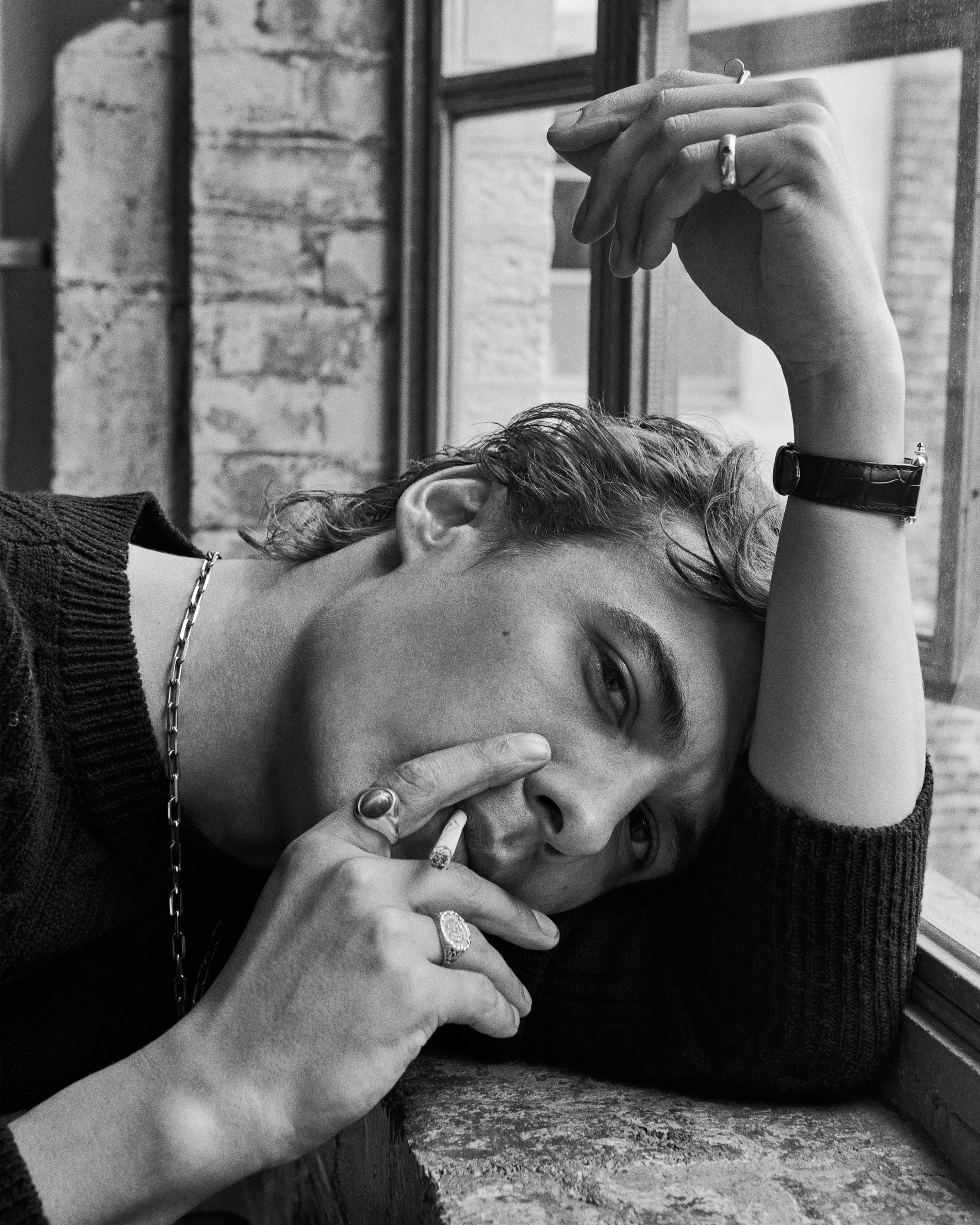 Jumper, trousers & shoes FERRAGAMO; necklace, watch and ring on left hand index finger CARTIER; all other rings Frank’s own