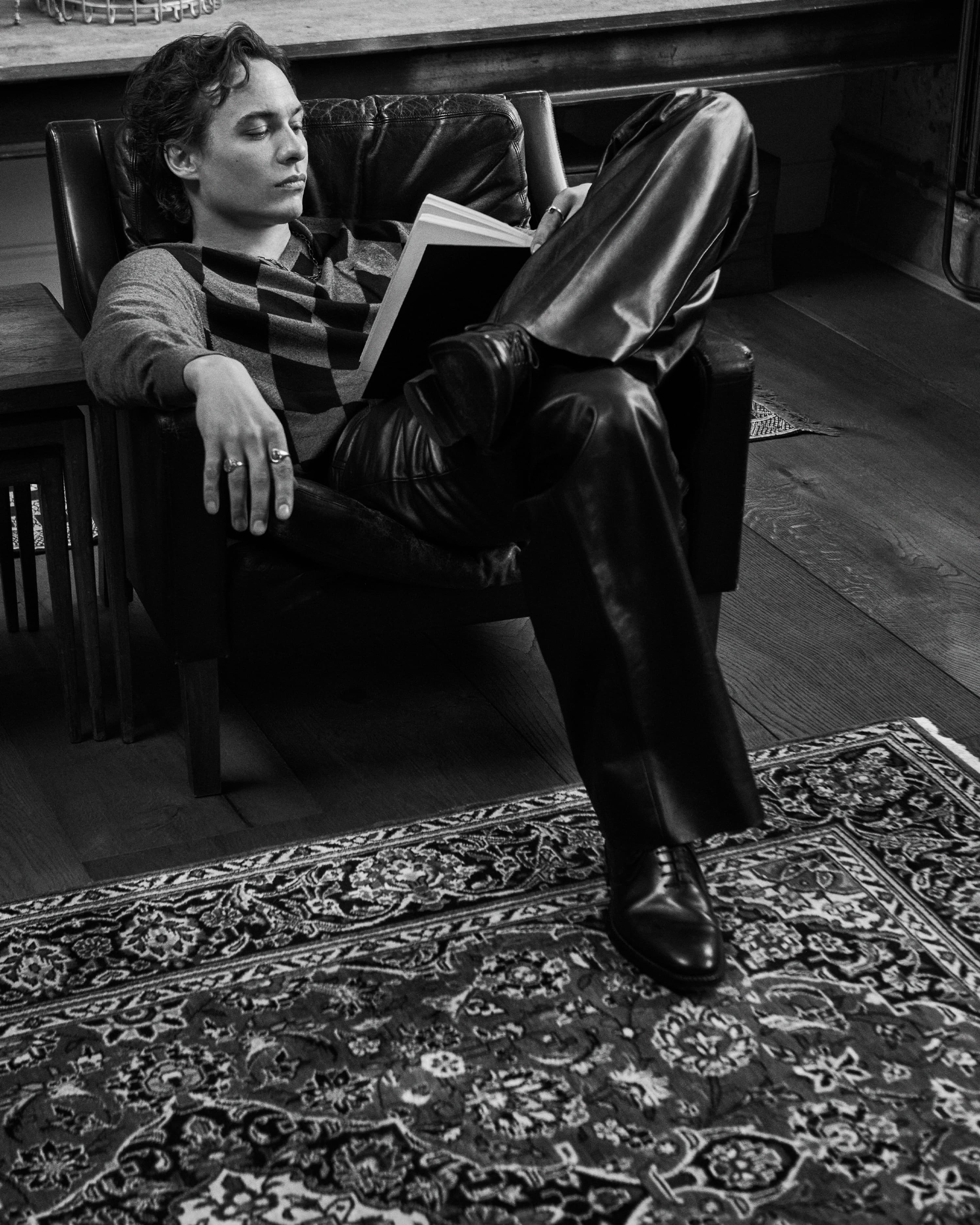 Jumper, trousers, boots PRADA, vest SUNSPEL, necklace, watch and ring on left hand index finger CARTIER; all other rings Frank’s own