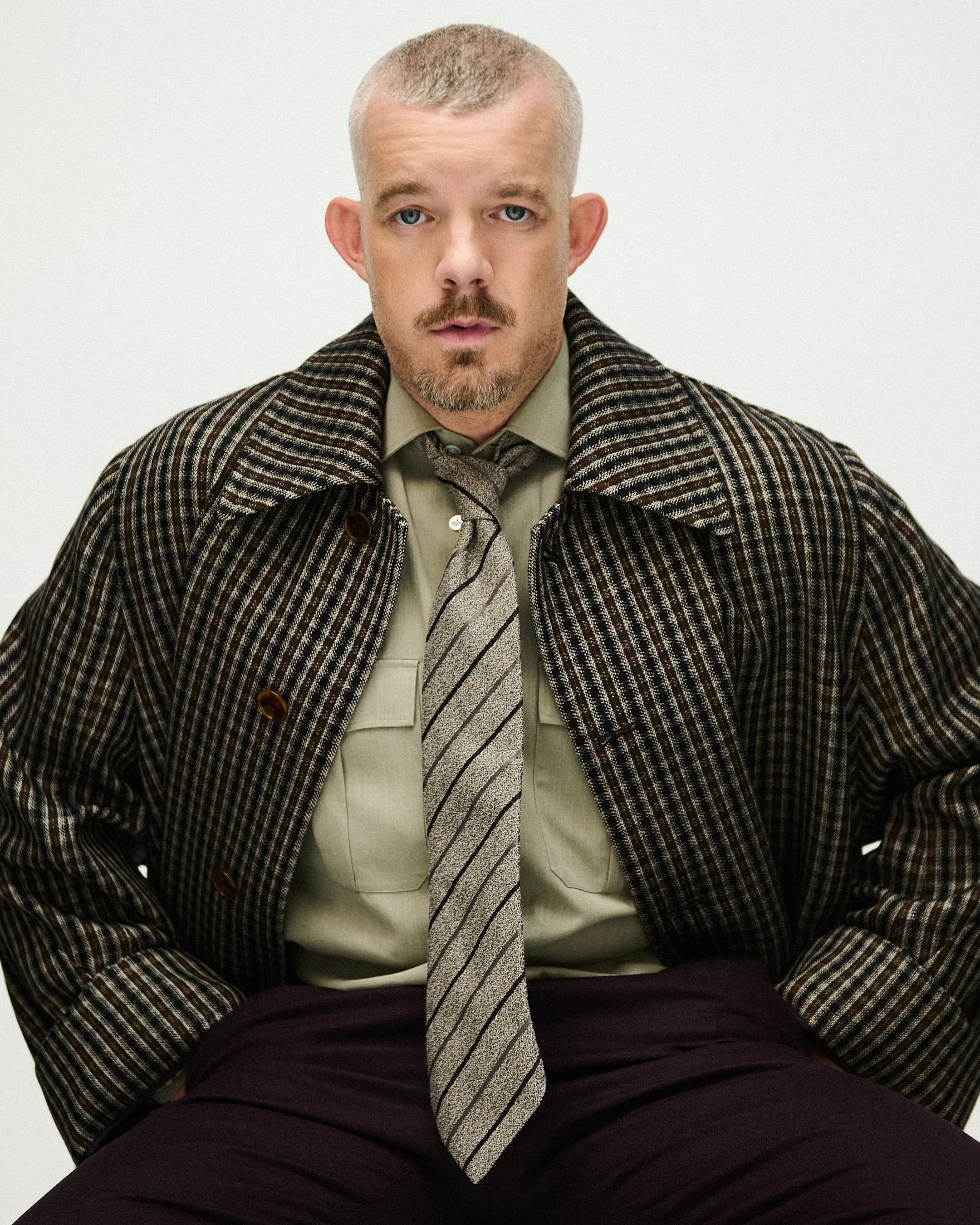 Russell wears jacket LANVIN; trousers BERLUTI; shirt EDWARD SEXTON; tie STYLIST'S OWN