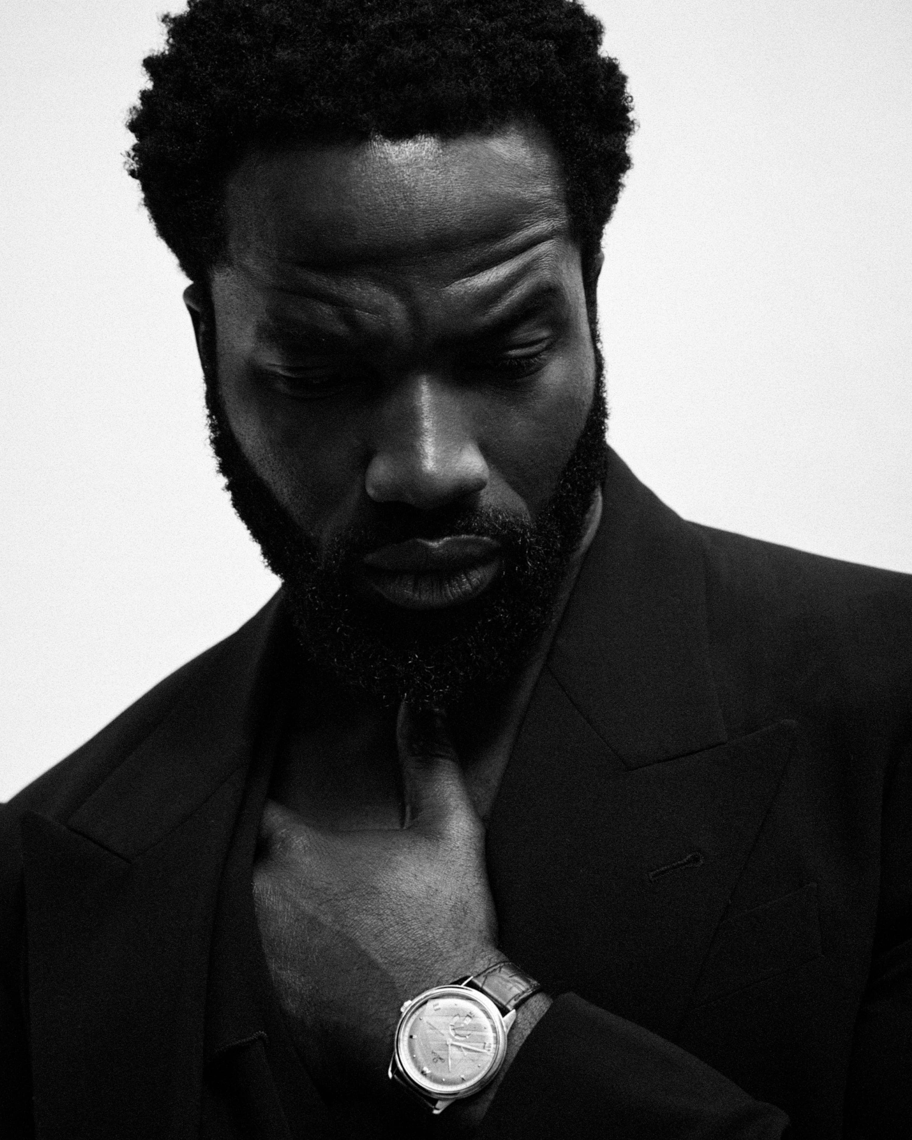 Ṣọpẹ́ wears jacket Zegna; timepiece Omega