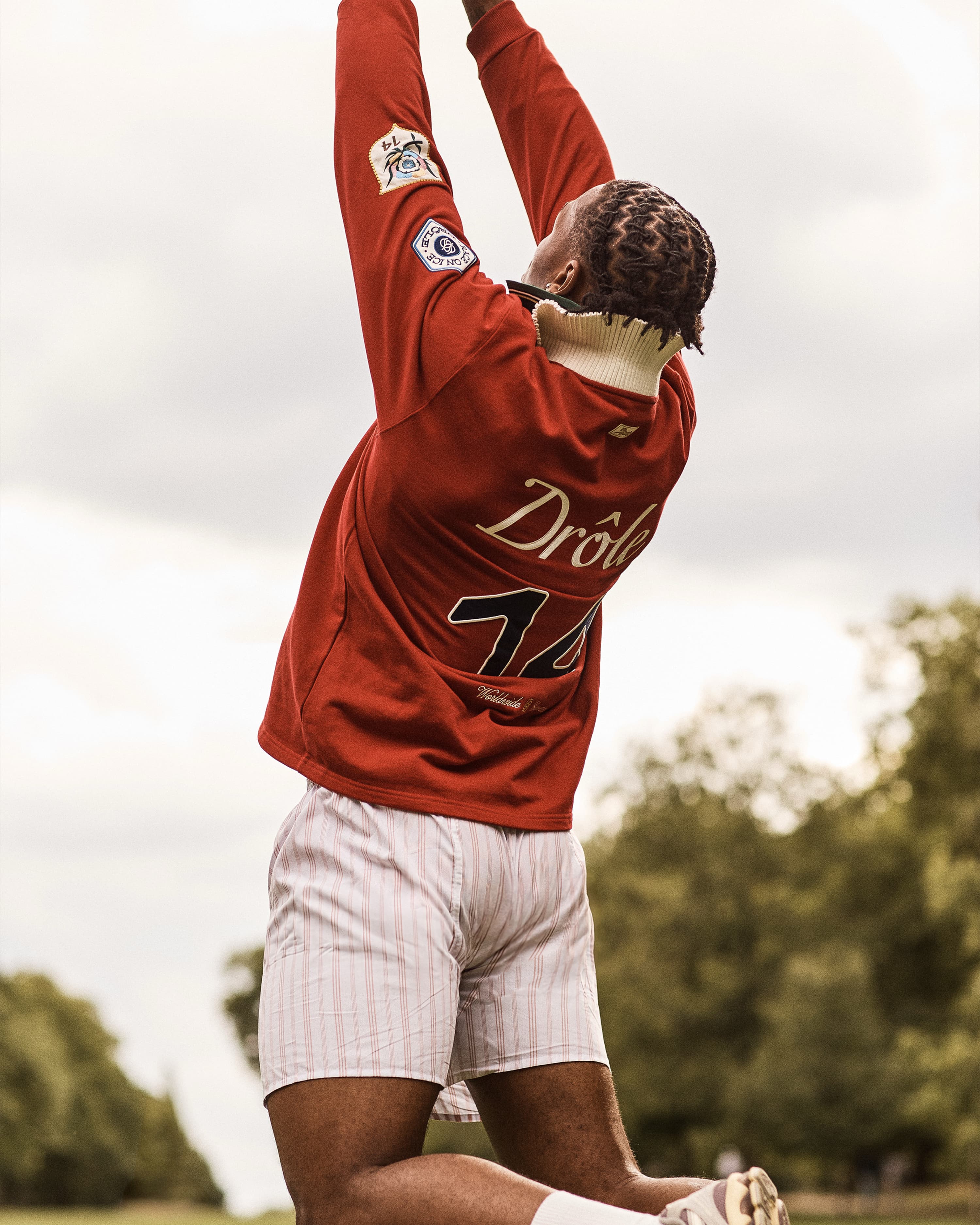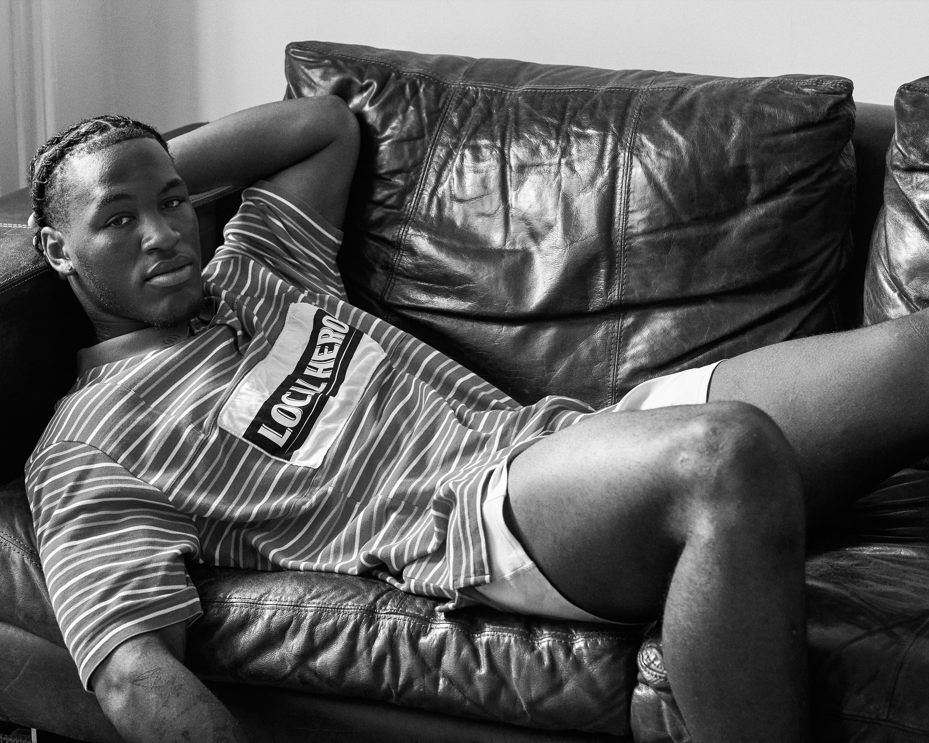 Off the pitch, he’s transferring that playful flair to his style. The well-worn teenage Nike tracksuits have been sidelined for a more curated, self-assured look of late. “My older sister was really into fashion, so she put me onto vintage clothes and baggier clothes. More chill vibes, things that I wouldn’t really wear when I was about 16 or 17,” he shares. “I feel like I’m way more comfortable now. I’m not the best dresser, but some of the fits that I’m pulling off now, some of the boys think that I’m going out somewhere when, really, I’m just going back home and watching a movie. But it’s just because I’m comfy and because colours are matching or colours are coordinating.”
