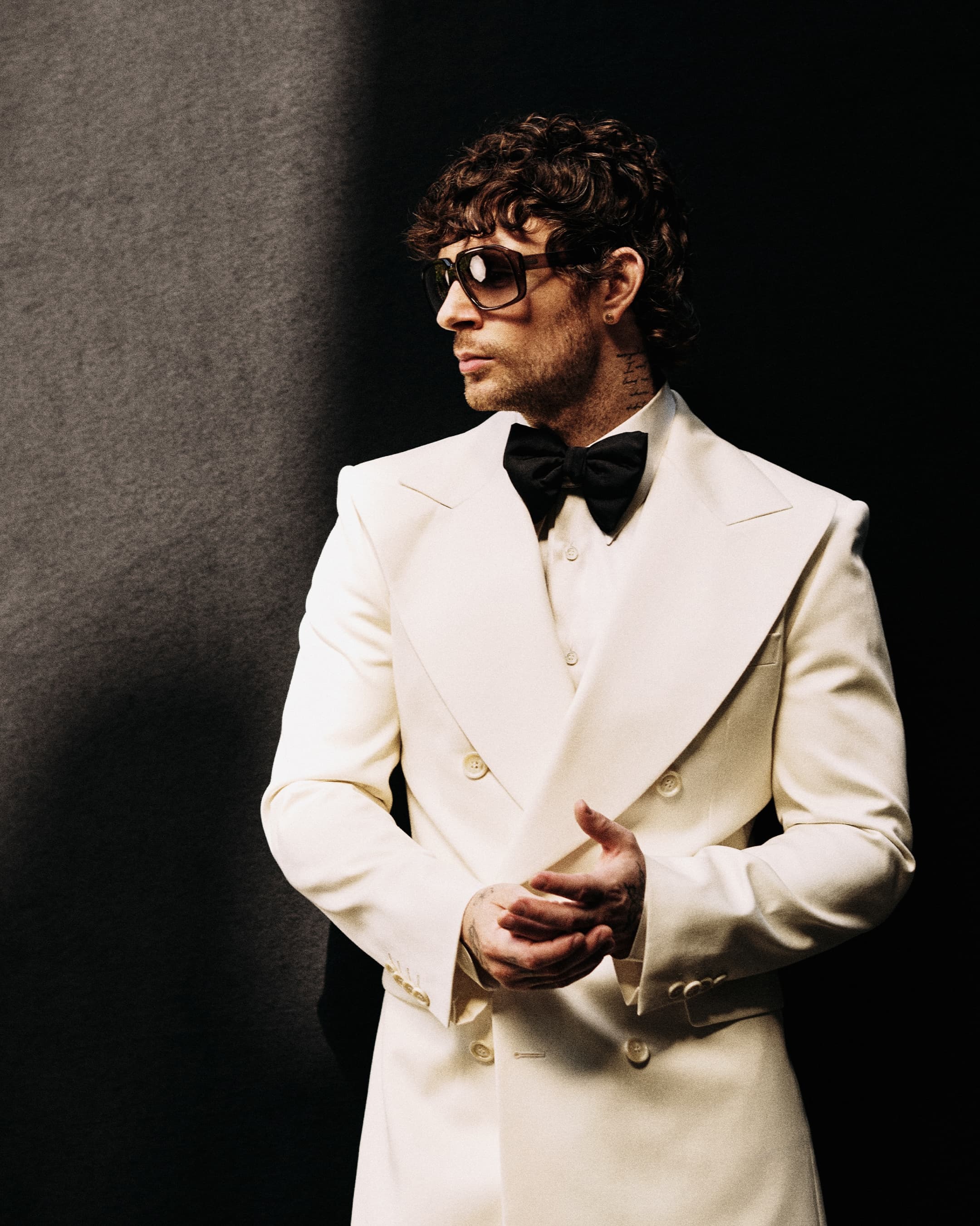 Tom wears suit & shirt BEN COBB X TIGER OF SWEDEN; boots ROKER; bow tie DOLCE & GABBANA; sunglasses GUCCI