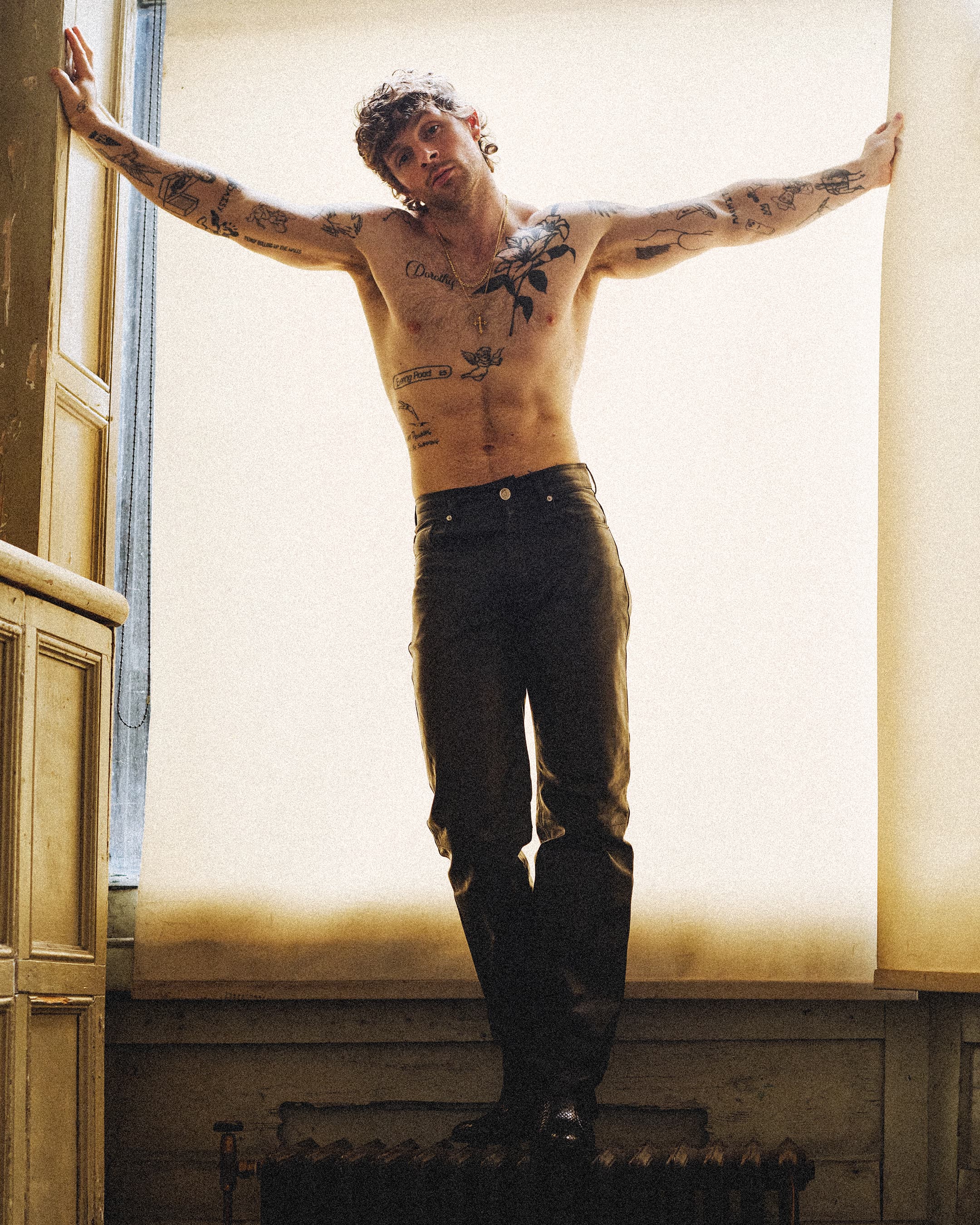 Tom wears cross necklace EMANUELE BICOCCHI; chain Tom’s own (throughout)